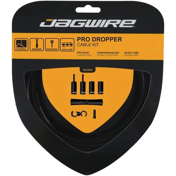 Les tiges de selle Vario sont aujourd’hui presque indispensables sur les VTT modernes. Le kit Jagwire Pro Dropper Kit permet d’obtenir des performances maximales. Le train Pro Level poli de 0,8 mm spécifique au compte-gouttes relie de façon transparente le levier de commande à distance et le bras d’entraînement pour assurer un mouvement en douceur des trains. Comme toutes les petites pièces nécessaires sont incluses, les kits Pro Dropper sont faciles et rapides à installer.
